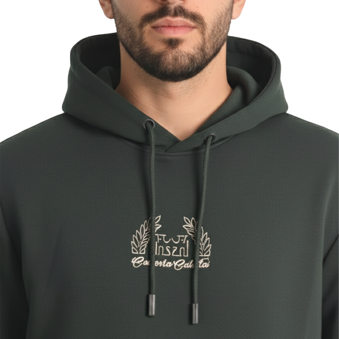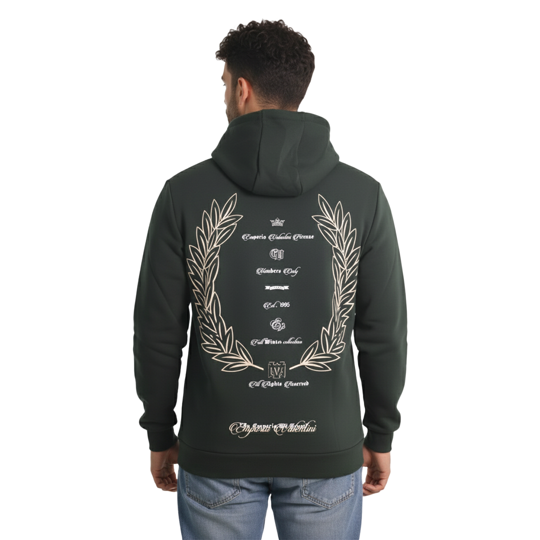 ارتقِ بإطلالتك اليومية مع هودي Emporio المصمّم ليجمع بين الراحة الفائقة والتفاصيل الراقية. يتميّز هذا الهودي بلونه الأخضر الداكن الأنيق، مع تطريز فاخر على الصدر ورسمة خلفية مميّزة مستوحاة من الأسلوب الكلاسيكي التراثي